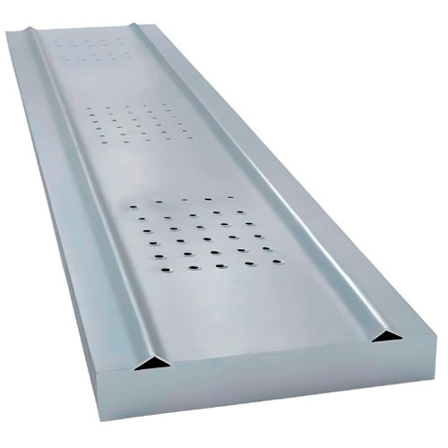 Piso fabricado em chapa de aço, com estrutura antiderrapante e reforços inferiores.