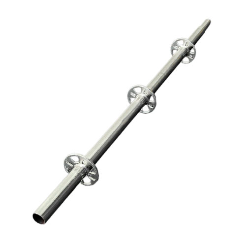 Elemento montante vertical, com encaixe pelo sistema macho e fêmea. Utilizado para montagem de andaimes com rosácea octogonal que possibilita a armação em oito direções diferentes.